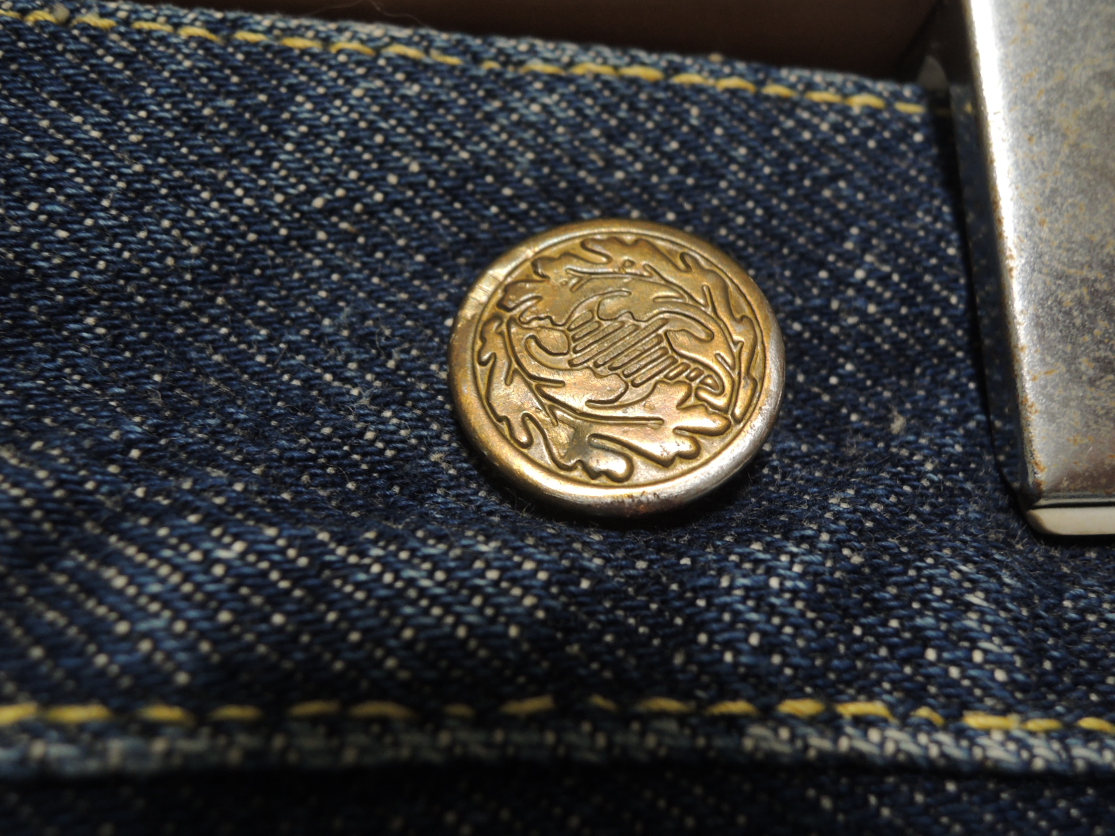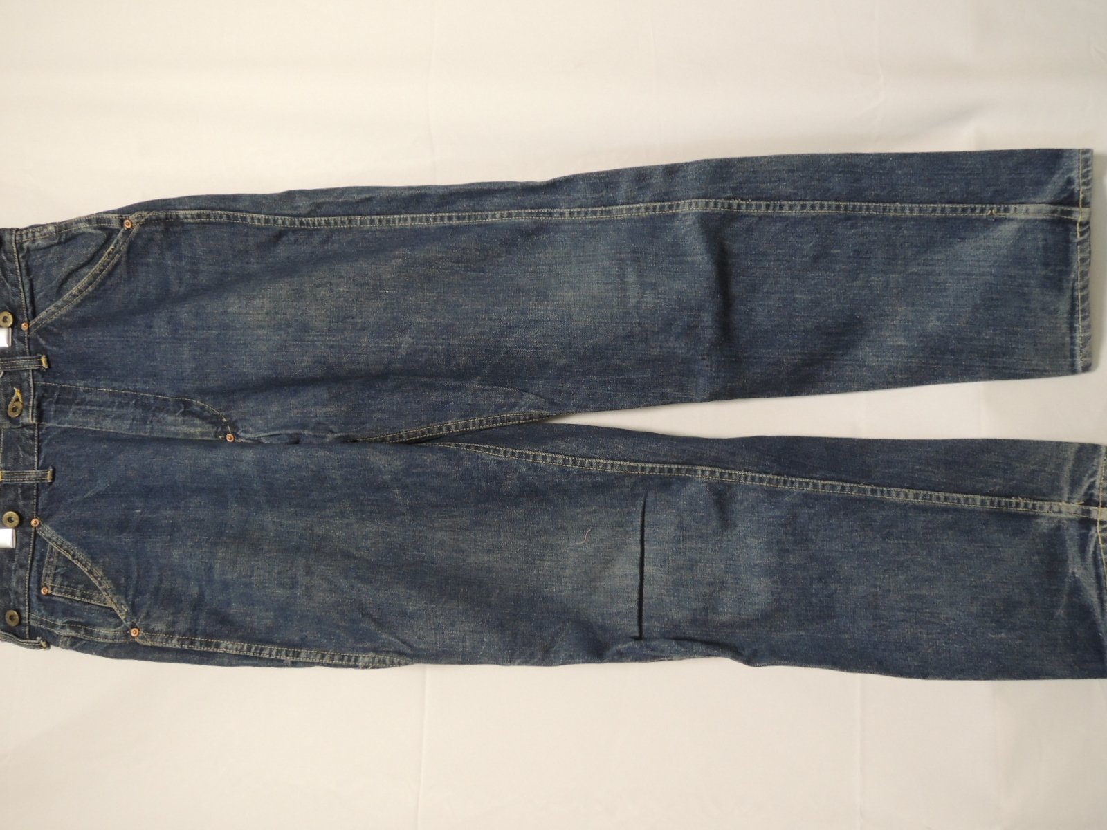 USED品のため着用感があり、バック左のサスペンダーボタンが交換されています。着用に伴うステッチ切れや抜け、擦れ切れ、小傷のある箇所などあります。(該当画像参照)全体的に経年した質感がありますが、着用に支障となるダメージ等ありません。当方主観では気にならない程度です。色落ちの仕方も独特で、タテ落ちがはっきり出て良い雰囲気が出ていると思います。