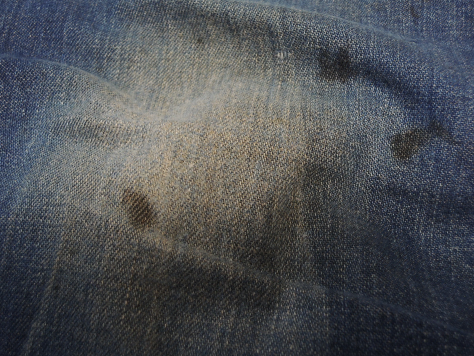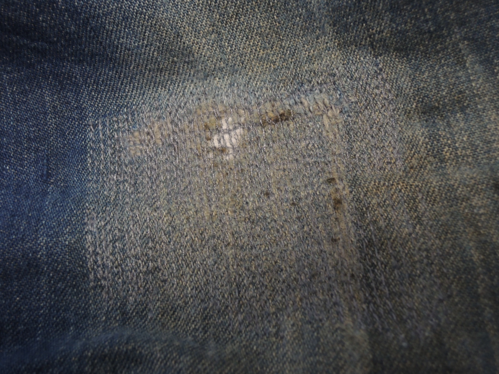 USED品で着用感があり右膝にリペアやオイル染み、薄い汚れ、色落ち、若干のステッチ切れのある箇所などあります。(該当画像参照)着用に支障となるダメージ等ありません。全体的に経年した質感がありますが色も濃い目でヴィンテージ独特の風合いが出ております!