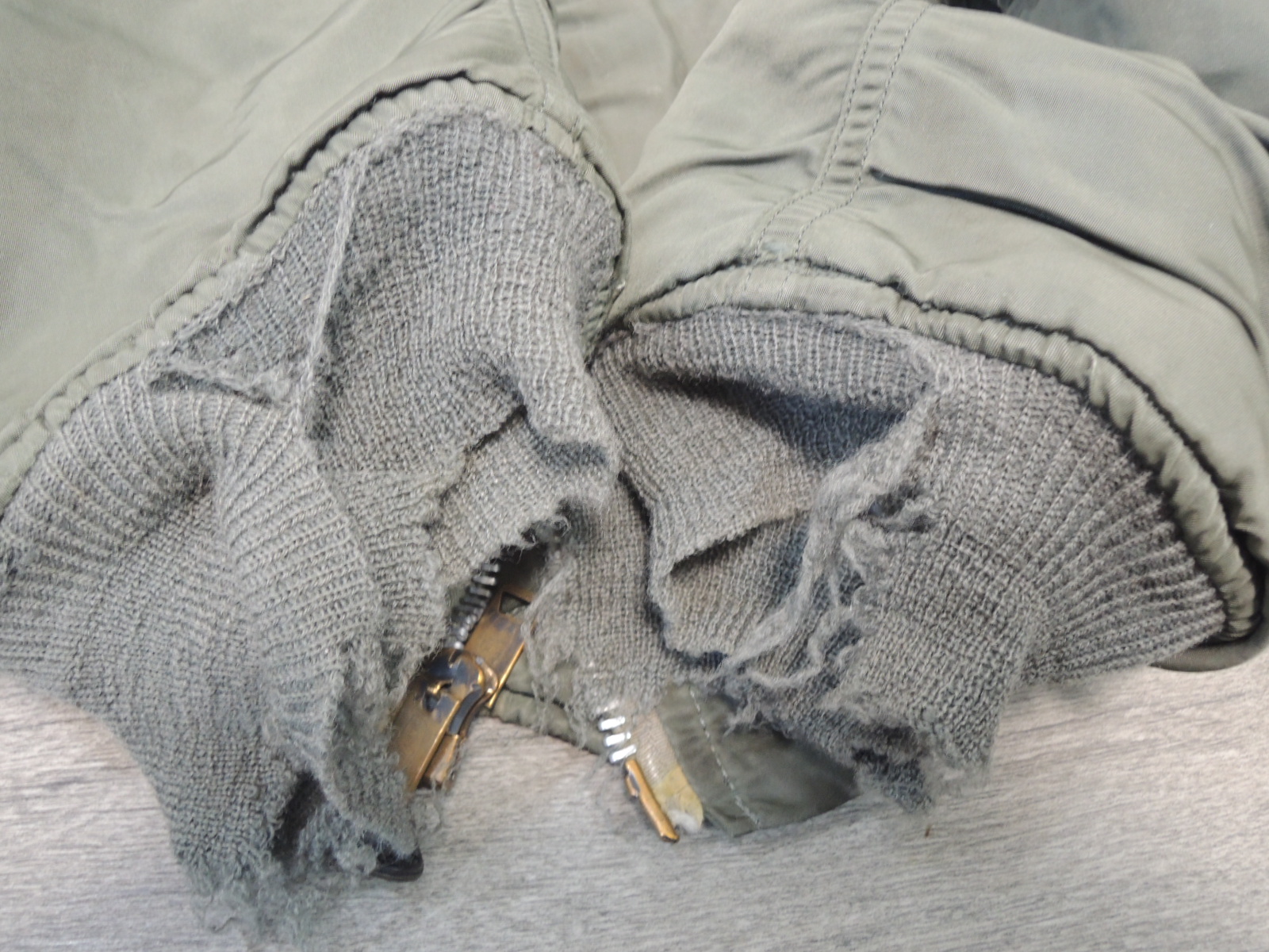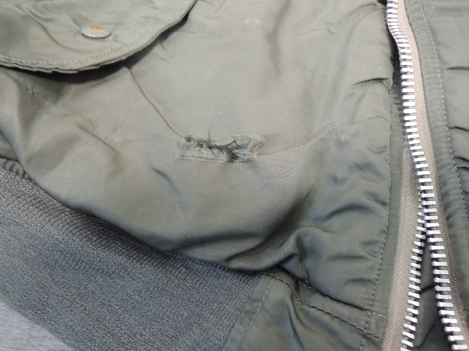 ・USED品で右袖、フロントに破れ、ワッペンの剥がした跡、襟、袖、裾リブに破れ、虫食いや小穴、ほつれ(があります。ポケット口にリペア(画像でご確認下さい。)