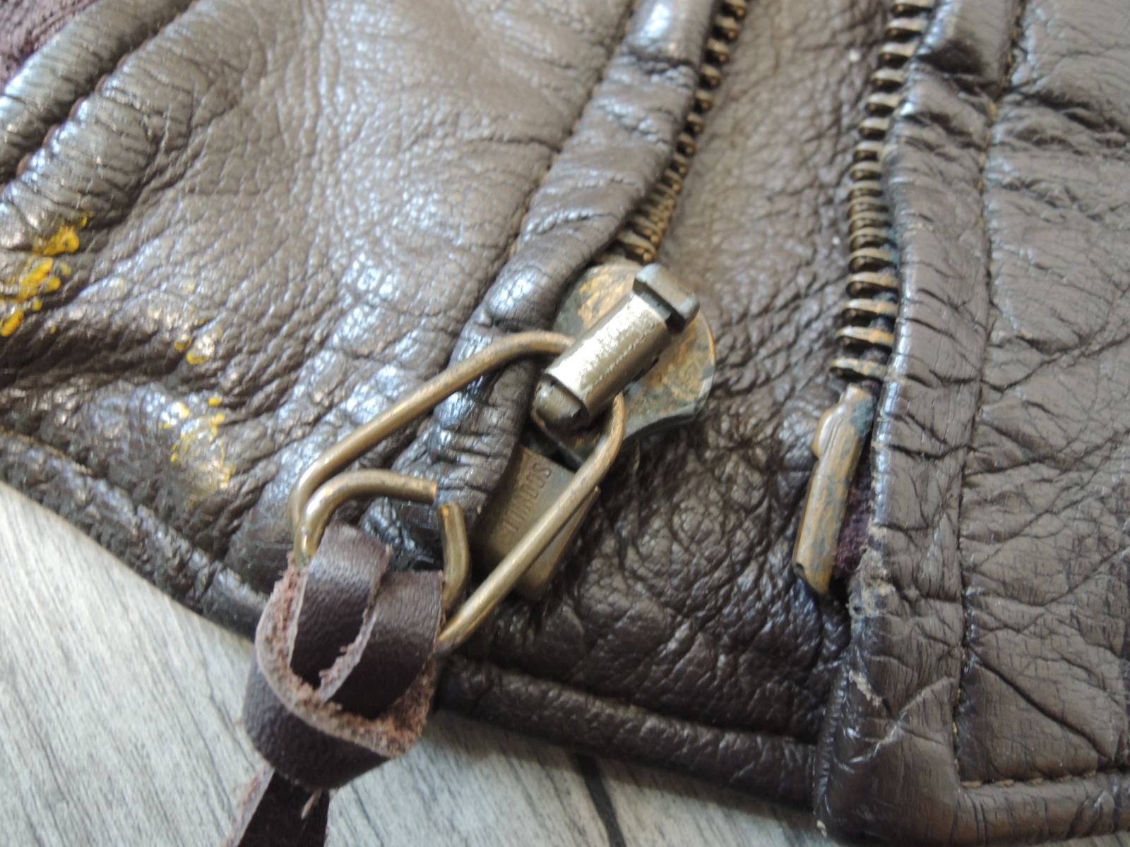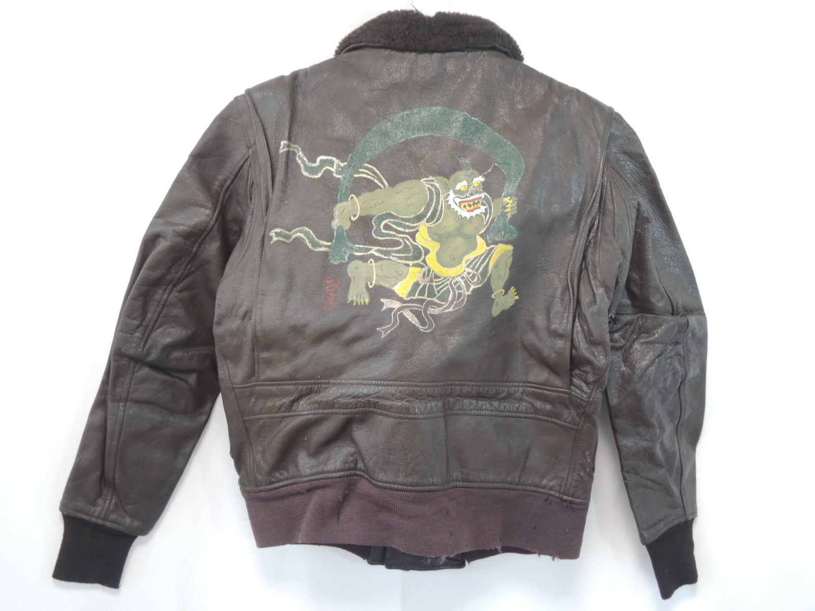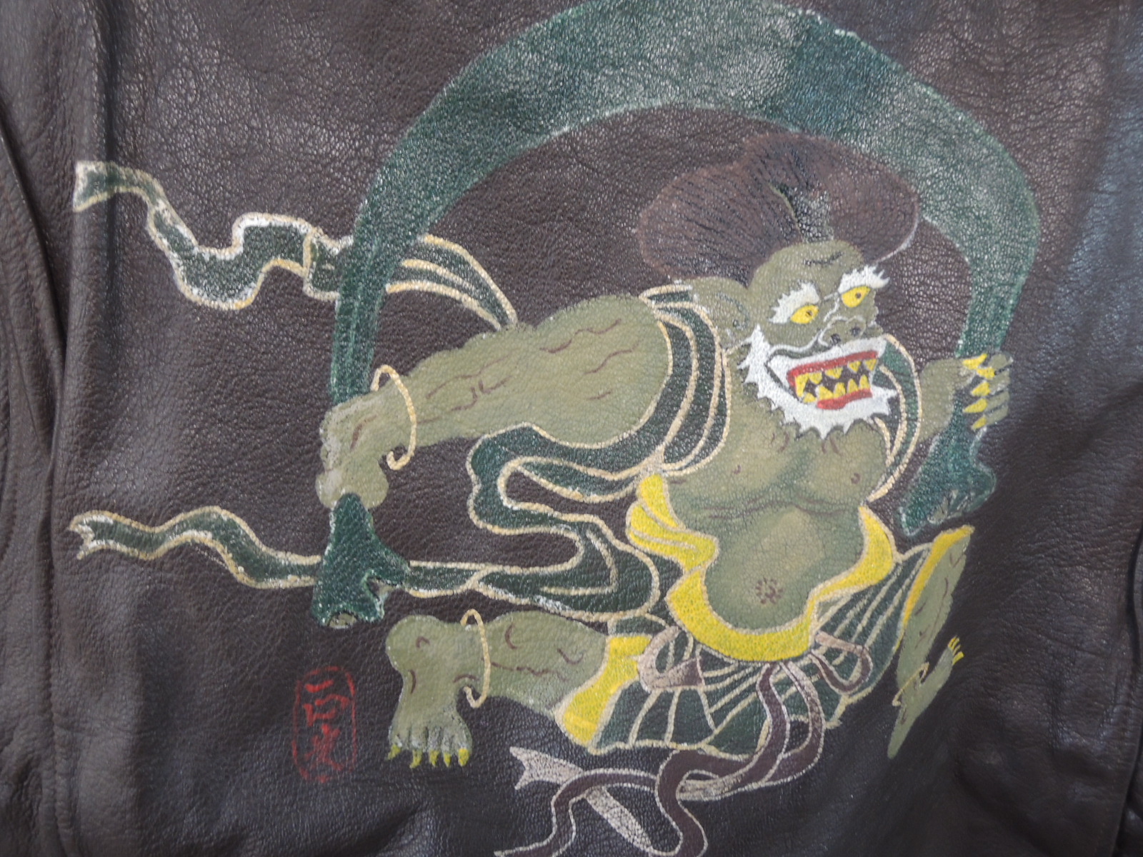 ・ハンドペイントバックにあしらわれた日本の伝統的なモチーフである「風神」のような雷神図が描かれています。(作者の落款印あり)目を奪われるレザージャケット。使い込まれたレザーの質感と、深みのあるブラウンが味のある一着。